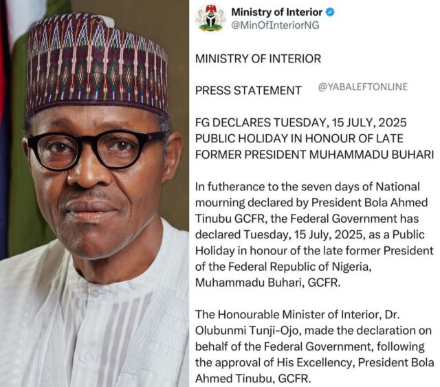 Nigeria’s Federal Government, acting on the approval of President Bola Tinubu, has declared Tuesday, July 15, 2025, a public holiday to honour the late former President Muhammadu Buhari. The declaration follows a seven‑day national mourning period that commenced on Sunday, July 13, 2025.
